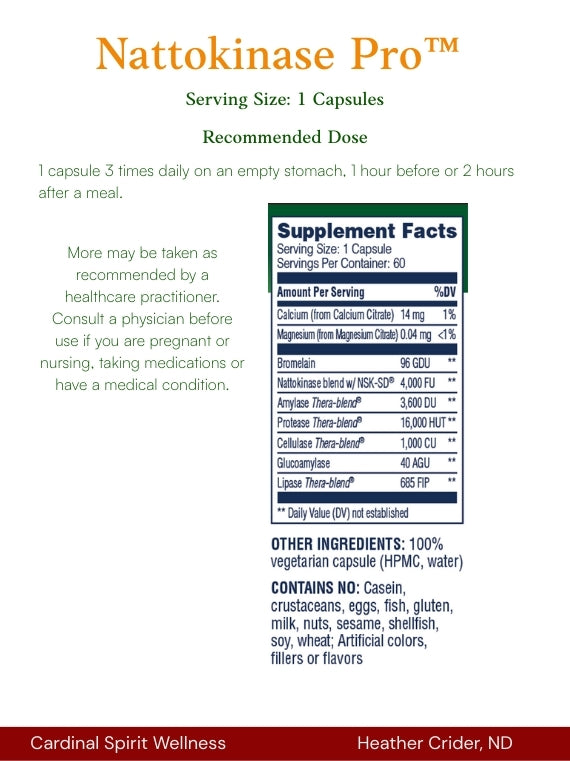 Nattokinase Pro™ contains NSK-SD®, the first nattokinase derived from the food natto, to be introduced to the US market. In combination with nattokinase, a comprehensive blend of supportive enzymes works synergistically to promote total body wellness and cardiovascular health.* Nattokinase helps to maintain healthy levels of fibrin by encouraging healthy blood coagulation for an optimally functioning cardiovascular system.* Natto naturally contains high levels of vitamin K2, which is essential for blood coagulation. Nattokinase NSK-SD is processed in a unique way to remove Vitamin K2 for those who should restrain from consuming this nutrient.