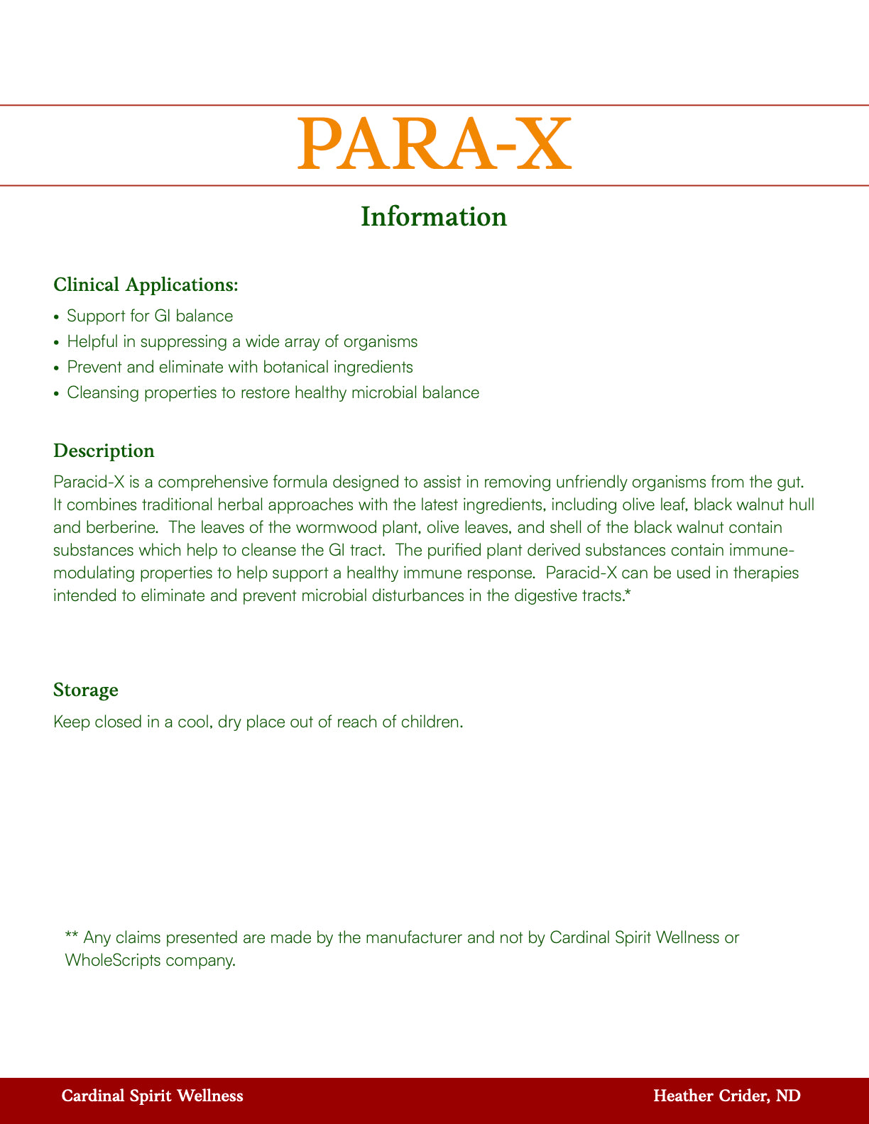 Paracid-X is a comprehensive formula designed to assist in removing unfriendly organisms from the gut. It combines traditional herbal approaches with the latest ingredients, including olive leaf, black walnut hull and berberine. The leaves of the wormwood plant, olive leaves, and shell of the black walnut contain substances which help to cleanse the GI tract. The purified plantderived substances contain immune-modulating properties to help support a healthy immune response. Paracid-X can be used in therapies intended to eliminate and prevent microbial disturbances in the digestive tract. *